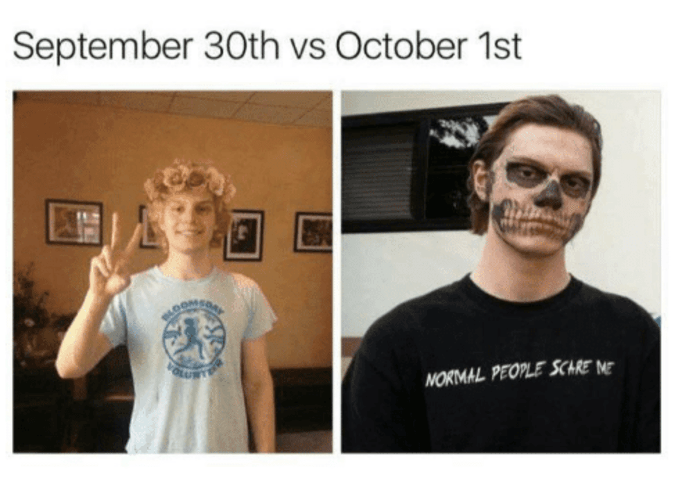 About September is a classic 1978 funk RB song released by the band Earth Wind and Fire which later became popularly used in video remixes online. September 30th Vs October 1st Memes images similar and related articles aggregated throughout the Internet. Looking for some funny Halloween memes. Fun gun memes for fun gun people. October 1st refers to a series of jokes most popular on Twitter where people post a normal-looking photo to represent September 30th and a photo of the same subject looking much more Halloween-themed to represent October 1st. Me on September 1st. Me On September 1st Meme.
